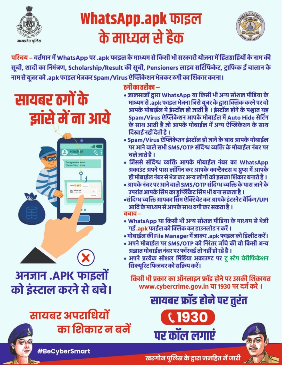 देश और दुनिया के लिए चुनौती देता साइबर अपराध,इस भागम भाग वाली जिंदगी में परिवार का एक नया सदस्य हैं , मोबाइल जिसके बिना जीवन अधूरा शा लगता है ,मगर एक ग़लत किलिक आपका पूरा जीवन बर्बाद कर सकता है ,इसी तारतम्य में आज दमोह साइबर टीम ने आपरेशन सेफ किलिक के तहत साइबर सेल से प्र.आर. सौरभ टंडन एवं राकेश अठया द्वारा जबलपुर नाका, किल्लाई नाका स्टैट बैंक, ATM में पहुचकर पंपलेट वितरण कर सायबर संबंधी जानकारी देते हुये इन्टरनेट सेफ्टी, ओ.टी.पी. डिजिटल अरेस्ट, ए.पी.के फाईल, फर्जी लोन एप आदि के बारे में समझाईस दी गई।