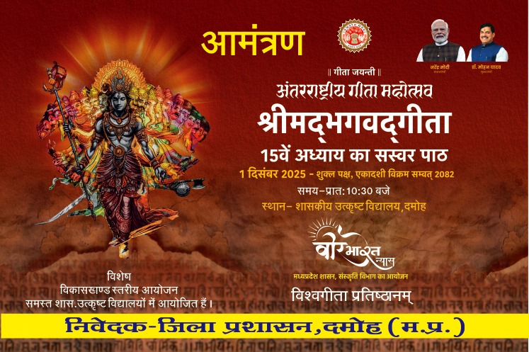 दमोह जिले में अंतर्राष्ट्रीय गीता महोत्सव का भव्य आयोजन 01 दिसंबर को किया जाएगा। कार्यक्रम सुबह 10:30 बजे से जिले के सभी शासकीय उत्कृष्ट उच्चतर माध्यमिक विद्यालयों — दमोह, हटा, पटेरा, तेंदूखेड़ा, पथरिया, बटियागढ़ एवं जबेरा में एक साथ संपन्न होगा।